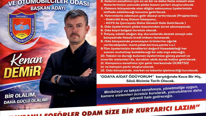 Ayrım gözetmeksizin tüm üyelerin temsilcisi olacağını belirten Kenan Demir, "Hiçbir üyemizi diğerinden ayırmadan, 671 hazirun yani oy kullanacak tüm meslektaşlarımın oylarına talibim. Kamyoncu, nakliyeci, servisçi, rent a carcı ve otopark işletmecisi tüm kardeşlerimin teveccühüyle odamızı daha ileriye taşımak istiyoruz. 24 Ocak’ta yapılacak seçimlerin odamız adına hayırlı ve uğurlu olmasını diliyorum" şeklinde konuştu.