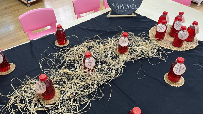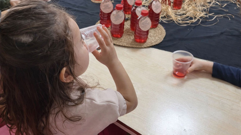 Öğretmenlerinin rehberliğinde gerçekleştirilen etkinlikte minik öğrenciler; su, doğal meyve aromaları ve hoş kokulu baharatları kullanarak şerbet yapımını deneyimledi. Malzemeleri sırayla kaba ekleyen ve titizlikle karıştıran çocuklar, süreç boyunca hem iş birliği yapma hem de paylaşma becerilerini geliştirdi. Hazırlık aşamasında şerbetin rengi, kokusu ve tadı üzerine yapılan sohbetlerle çocukların duyusal farkındalıkları desteklendi.