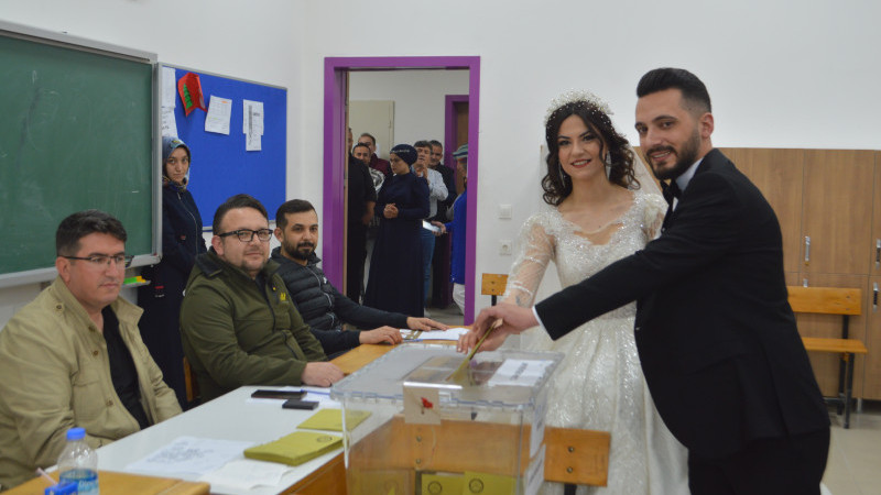 Kütahya'nın Tavşanlı ilçesinde gelin ve damat oylarını kullandıktan sonra düğün salonuna geçti.